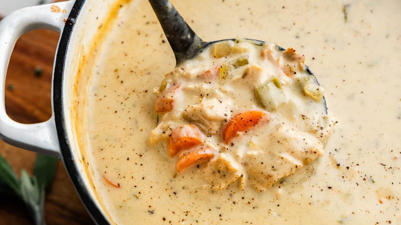 This comforting chicken soup is just what you’re craving during the cold fall and winter months. The sauce is rich and velvety, made with real cream and herbs. Add chunks of white chicken breast and vegetables for an easy, creamy, comforting bowl.